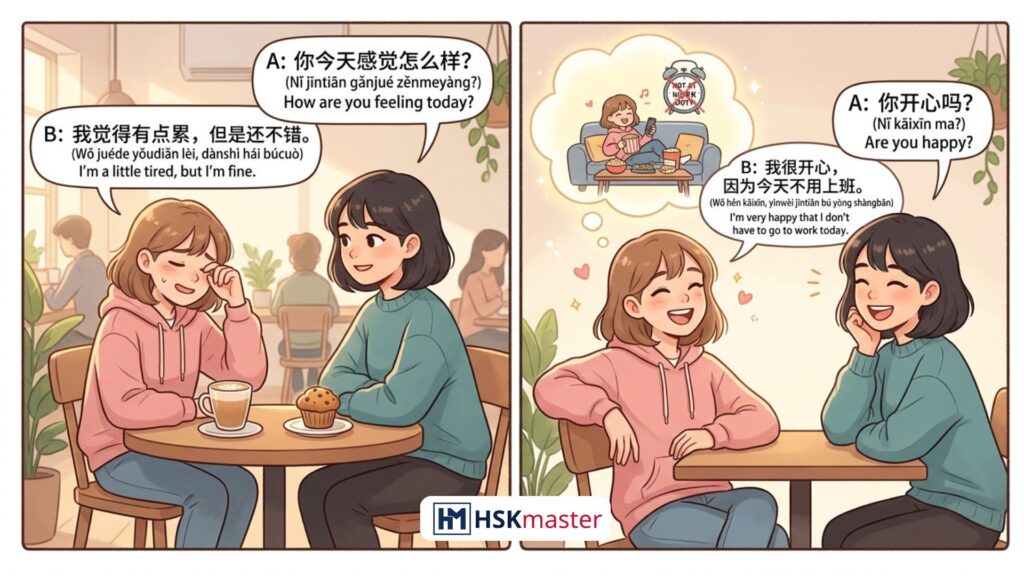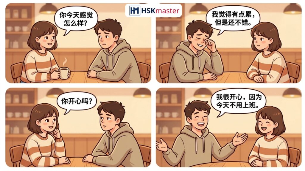 Trong giao tiếp, việc hỏi và trả lời về cảm xúc giúp cuộc hội thoại tự nhiên và sâu sắc hơn. Dưới đây là các cấu trúc chuẩn + ví dụ rõ ràng, bạn có thể áp dụng ngay khi nói tiếng Trung.