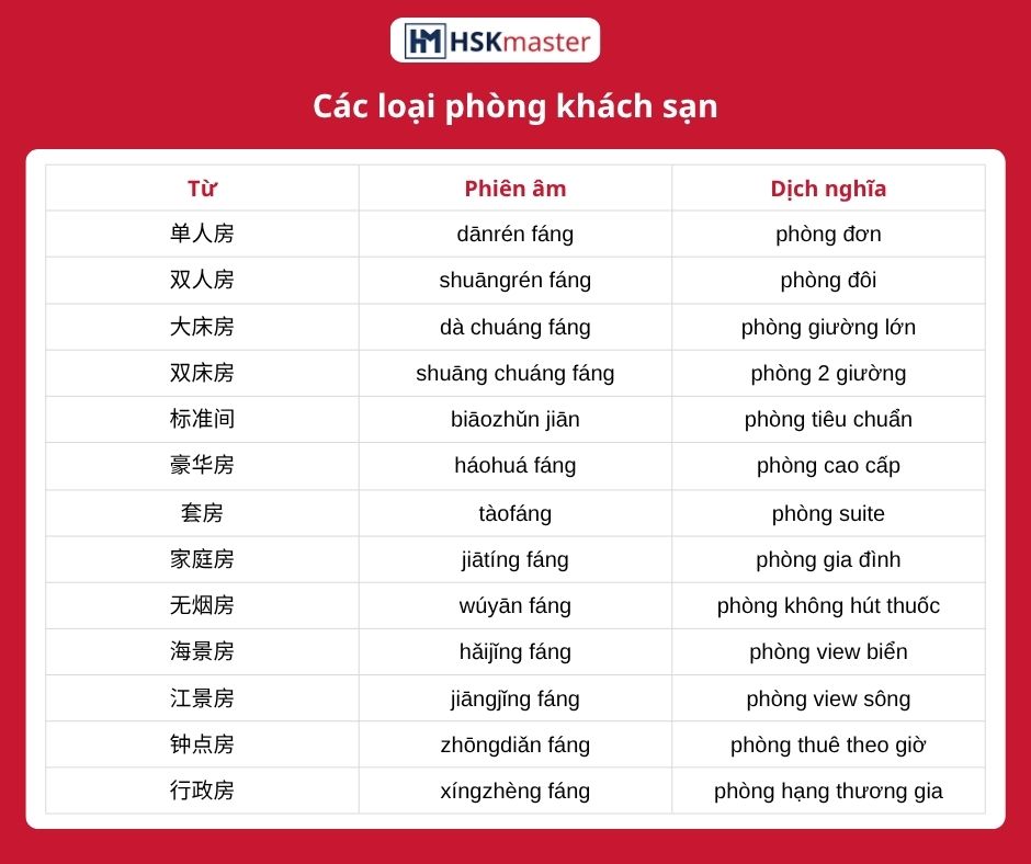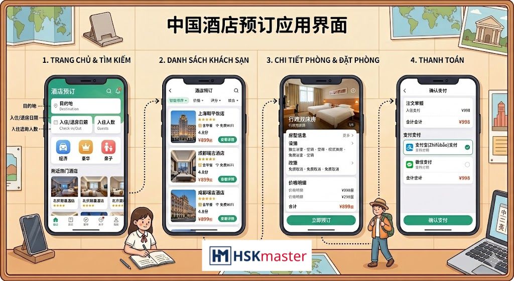 👉 Khi sử dụng các app đặt phòng của Trung Quốc, rất nhiều bạn dễ rơi vào trạng thái “lạc” giữa rừng tiếng Trung, hoang mang không biết bắt đầu từ đâu. Để có thể đặt phòng trên app thành công, HSKMASTER sẽ cung cấp cho các bạn hệ thống từ vựng thường xuất hiện trên app: