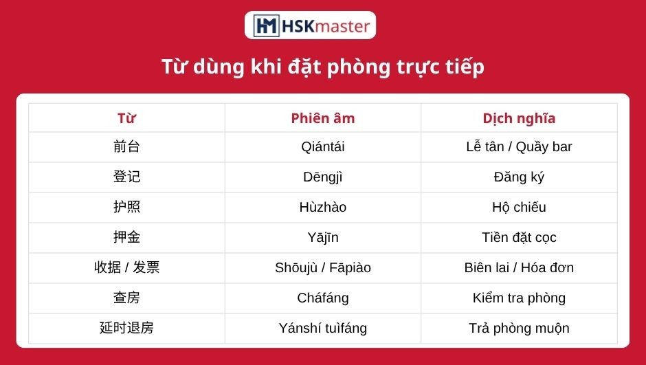 👉Bảng từ vựng cho đặt phòng trực tiếp: