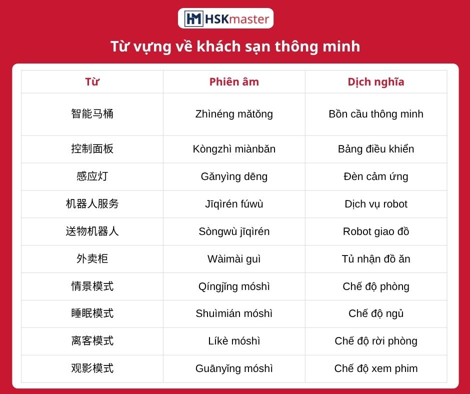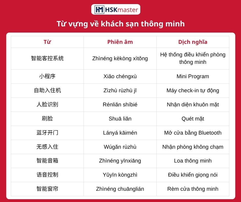 Bạn đã bao giờ tưởng tượng một chuyến du lịch mà từ lúc bước vào khách sạn cho đến khi trả phòng, bạn không cần phải nói một câu nào với lễ tân nhưng vẫn được phục vụ tận răng? Tại Trung Quốc, các Khách sạn thông minh (智能酒店 – Zhìnéng jiǔdiàn) đang biến điều đó thành hiện thực bằng những công nghệ cực đỉnh. Hãy cùng khám phá bộ từ vựng để tự tin check-in và tận hưởng không gian hiện đại này nhé!