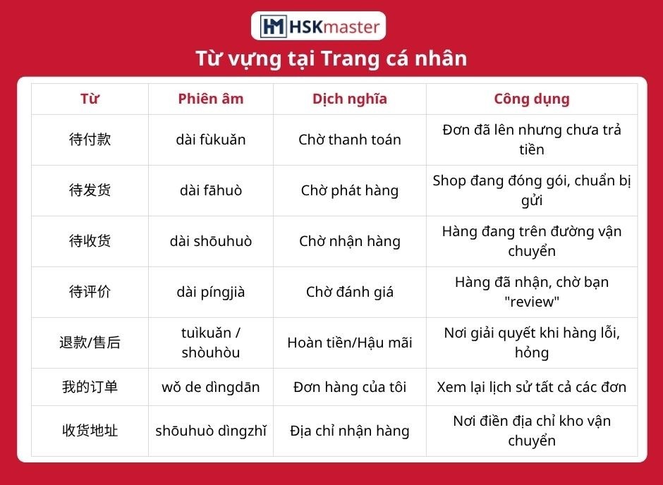 👉Lời khuyên cho người học: Khi dùng Taobao, hãy chuyển ngôn ngữ điện thoại sang tiếng Trung. Việc nhìn thấy các cụm từ như “我的订单” (Đơn hàng của tôi) hay “待收货” (Chờ nhận hàng) mỗi ngày sẽ giúp bạn ghi nhớ mặt chữ một cách tự nhiên mà không cần cố gắng học thuộc từ vựng.