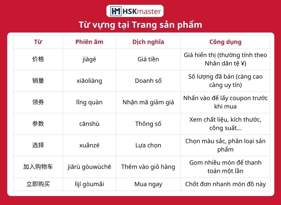 Bảng thuật ngữ tại “Trang sản phẩm” (宝贝 – Bǎobèi)