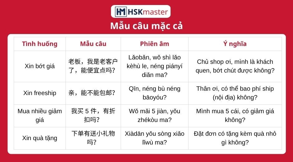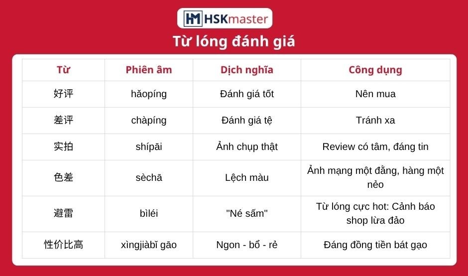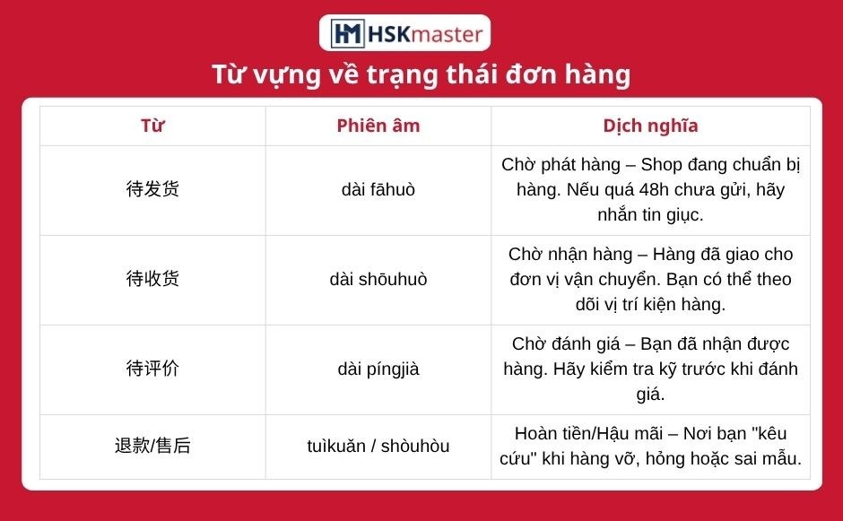 - 退货退款 (tuìhuò tuìkuǎn): Trả hàng và hoàn tiền (Khá khó khăn cho người mua từ Việt Nam vì phí gửi ngược lại Trung Quốc rất đắt).