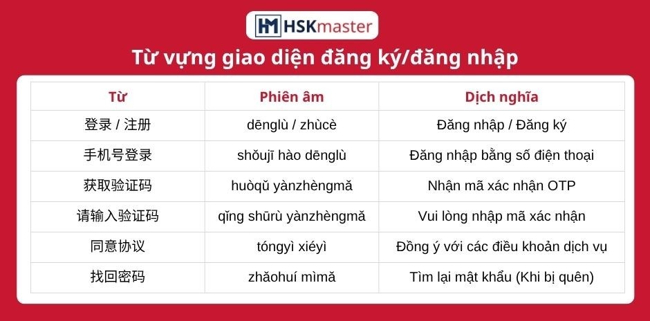 Bảng từ vựng trên giao diện Đăng ký/Đăng nhập