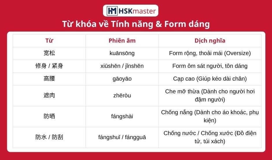 Nhóm từ khóa về Tính năng & Form dáng (功能 & 版型)