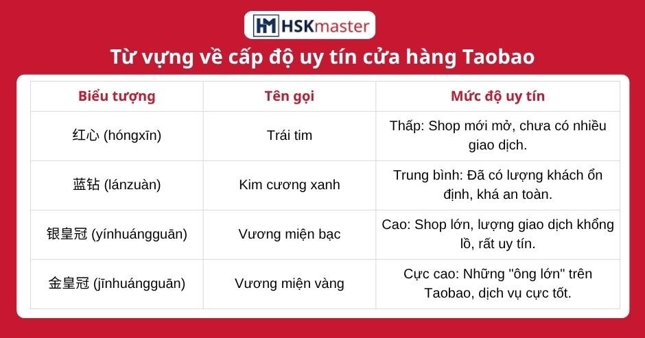 Bảng phân cấp độ uy tín cửa hàng (从低到高)