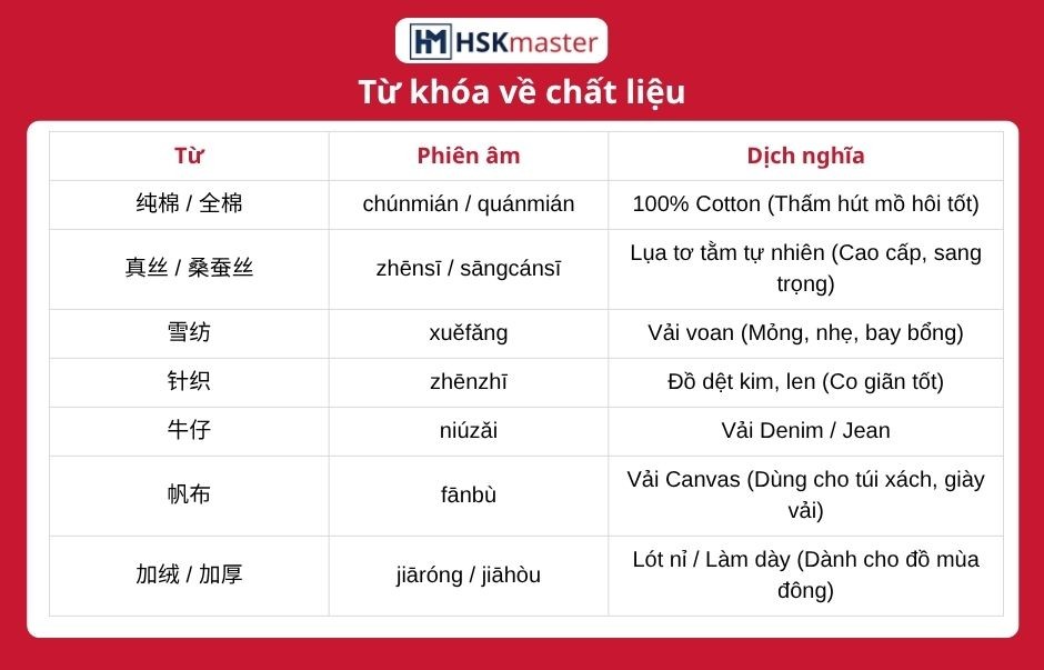 Nhóm từ khóa về Chất liệu (材质 – Cáizhì)