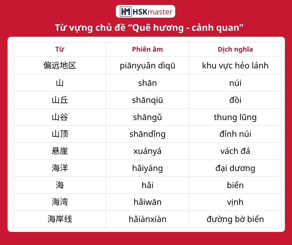 Quê hương luôn là nguồn cảm hứng bất tận đối với mỗi con người, là nơi để trở về. Vì thế mà để quê hương được đi xa hơn qua những lời kể, những câu chuyện, những bài luận thì không thể bỏ qua các từ vựng tiếng Trung về quê hương dưới đây. Hãy cùng HSKmaster khám phá ngay nhé!